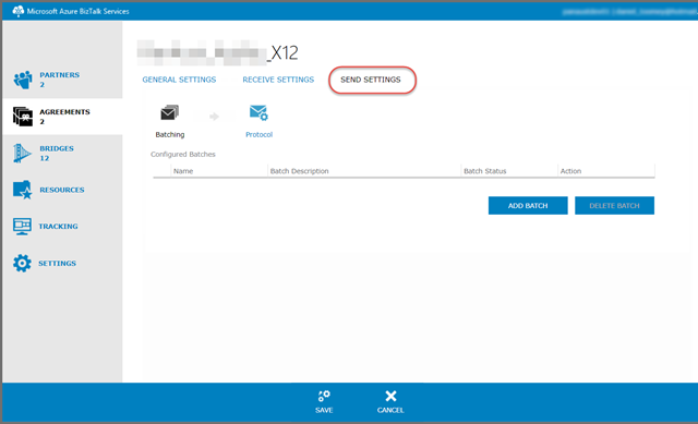 The General page has not changed, however both the Receive Settings and Send Settings views (predictably) display the complementary Protocol and Batching pages that were missing from the bridge view – and nothing else.