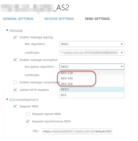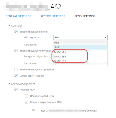Finally, let’s have a quick look at the AS2 configuration and the new digest and encryption algorithms available: