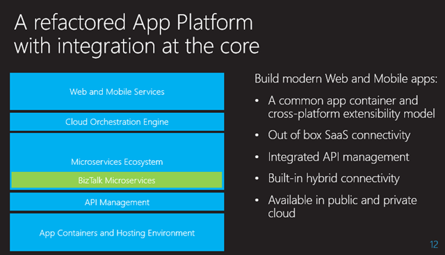 well aware of the importance of on-premises integration and the power of hybrid solutions. We can expect that new versions of BizTalk Server will include further enhancements to facilitate the implementation of hybrid integration solutions. We can also expect that the Microservices App Platform will be available via an Azure Pack – so you can employ the same technology both on-premises and in the cloud.