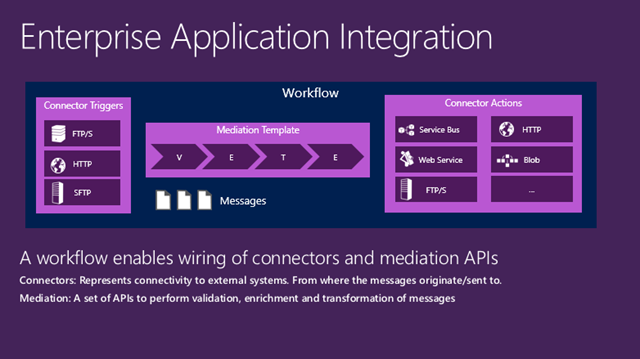 Pretty much every feature we are used to employing with BizTalk can be implemented as a microservice, including validation, debatching, transformation, workflow, business rules, EDI, etc., and we can expect that the gallery will come fully stocked with all the basic elements when the preview of this new platform reveals itself in March/April 2015 – including connectors for most common protocols, enterprise apps, and enterprise SaaS.