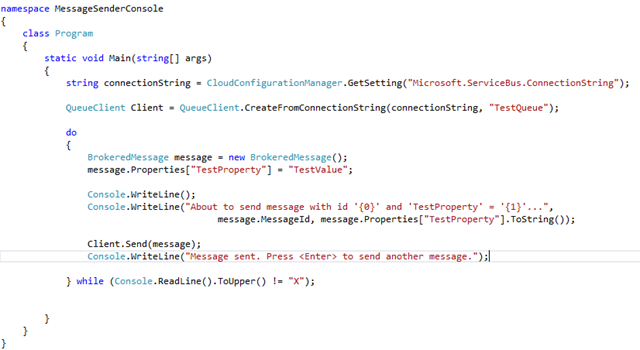 - Created a small console app to send a blank message to the queue; note that this only takes a couple of lines of code when using the Microsoft Azure Service Bus package available via Nuget: