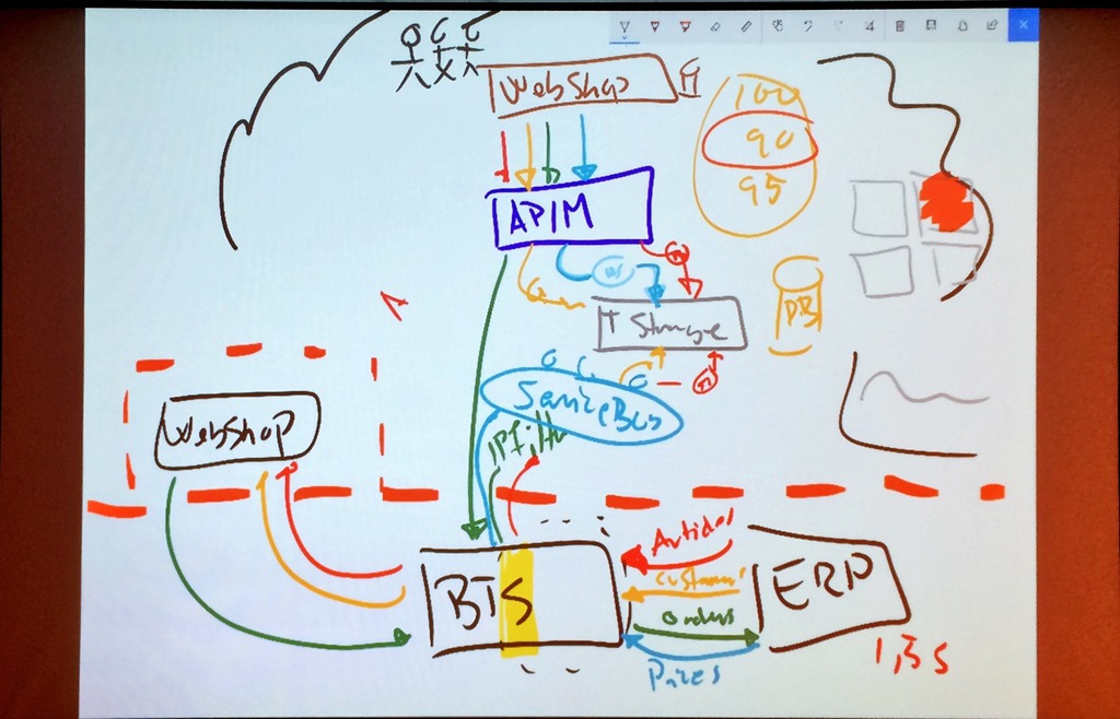 Wrapping up the presentations was Mattias Lögdberg on refining BizTalk Server implementations. Also a first-time speaker at INTEGRATE, Mattias wowed us by doing his entire presentation as a live drawing on his tablet! He used this medium to walk us through a real-life project where a webshop was migrated to Azure whilst retaining connectivity to the on-prem ERP system. A transition to a microservices-based approach and addition of Azure services enhanced the capabilities of BizTalk which still handles the on-prem integration needs.
