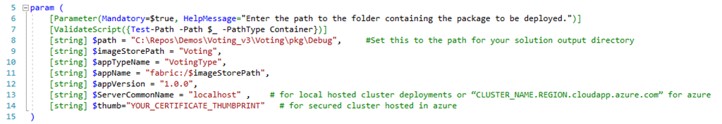 pathThis is the path to your packaged application. (This parameter is not required for the Undeploy_SFApplication.ps1 script)C:\Repos\Demos\Voting_v3\Voting\pkg\Debug