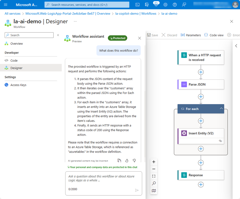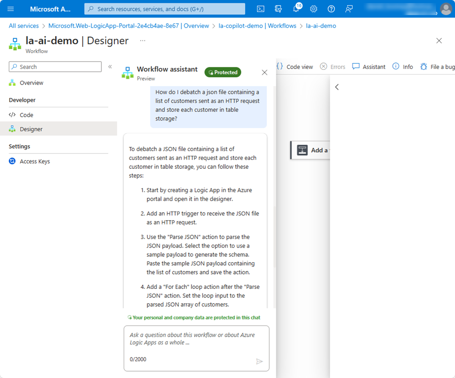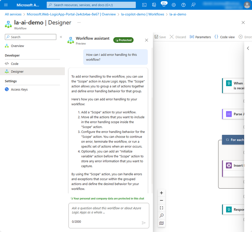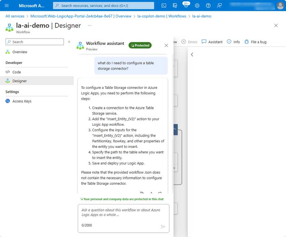 What’s more, the responses are determined by the workflow currently open and therefore reflect the relevant context. This is an extraordinary help to those who are not necessarily that familiar with all of Logic Apps capabilities.