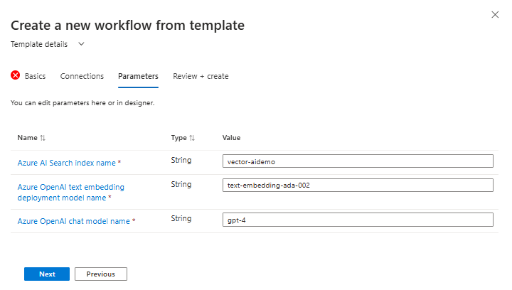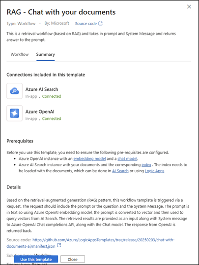 The template summary page identifies the required connectors for AI Search and OpenAI (which you would already have if you followed Stephen’s guide), as well as a description of what it does: