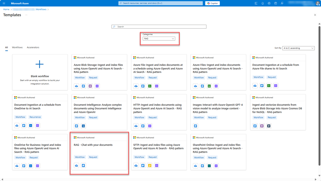 Logic Apps now provides a whole collection of templates to kick-start your workflow development (30 as of the date of this blog post). Searching on the dedicated “RAG” category yields a whopping 13 templates, including one for chatting with a RAG application: