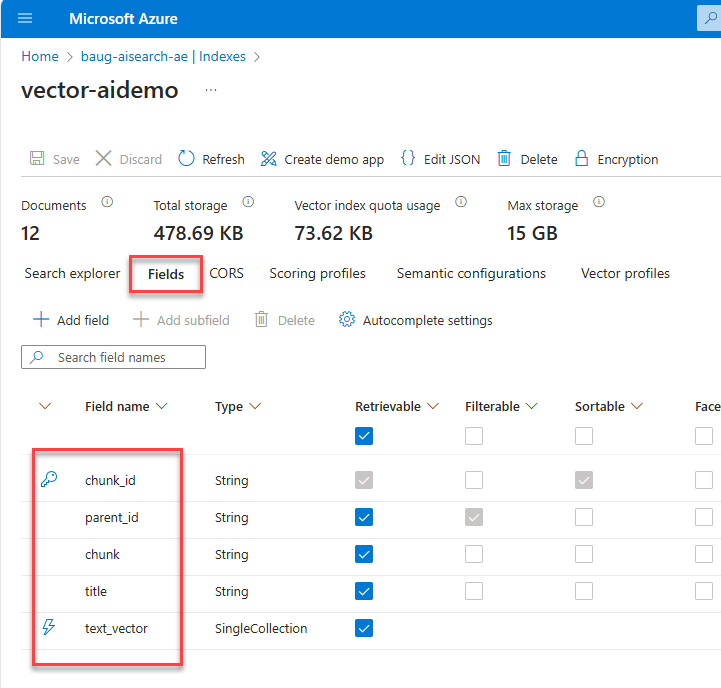 Once you have created the workflow, there are a couple of more tweaks to be made in the workflow designer before this will execute properly. These all have to do with the schema for the AI Search index, which is a little different to the one expected in the chat workflow template. You can find the details of this schema in your Azure AI Search index, clicking on the Fields tab: