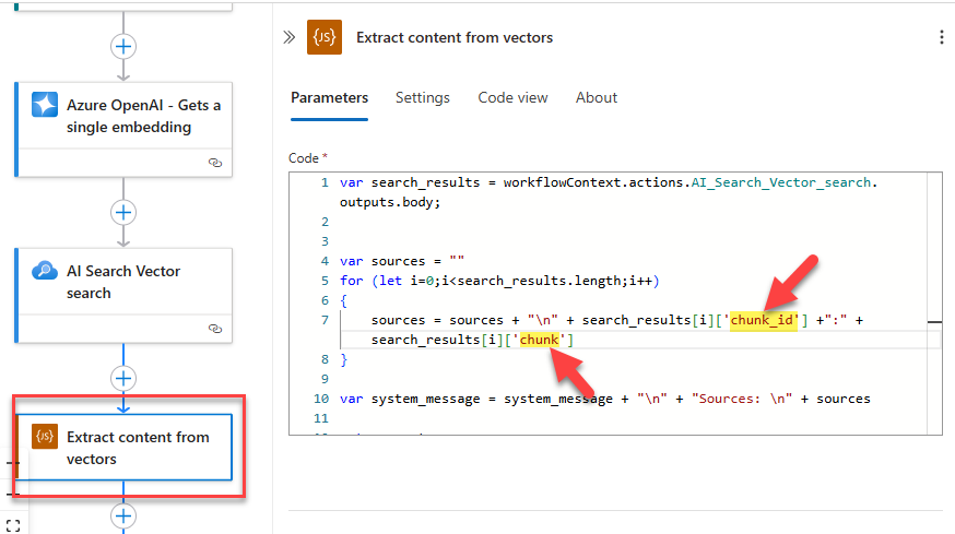 Next, in the Extract content from vectors action, replace the two schema field names with the correct ones in Line 7 of the Javascript code, to “chunk_id” and “chunk”, respectively: